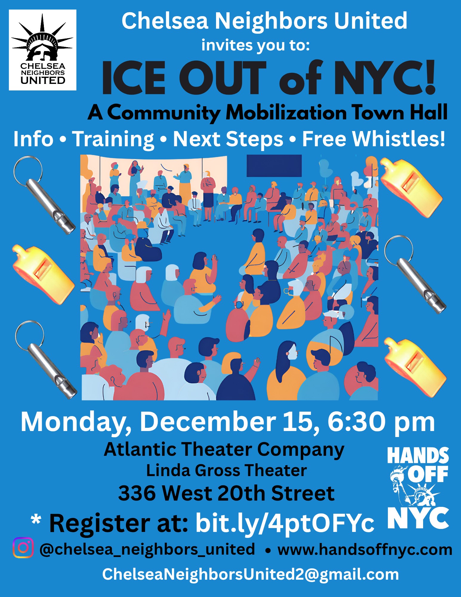 We are planning a Town Hall on Monday, Dec. 15 at Atlantic Theater Company at 336 West 20th St. (8 & 9 Aves.), 6:30 pm. The meeting will start at 6:30 p.m. and will include neighborhood ICE preparedness/Know Your Rights training by a representative of New York Immigration Coalition (NYIC). We’ll also talk about the many ways people can get involved. Free whistles will be handed out. Registration is required: bit.ly/4ptOFYc. Please share the registration info with friends and neighbors. We hope to see you there!