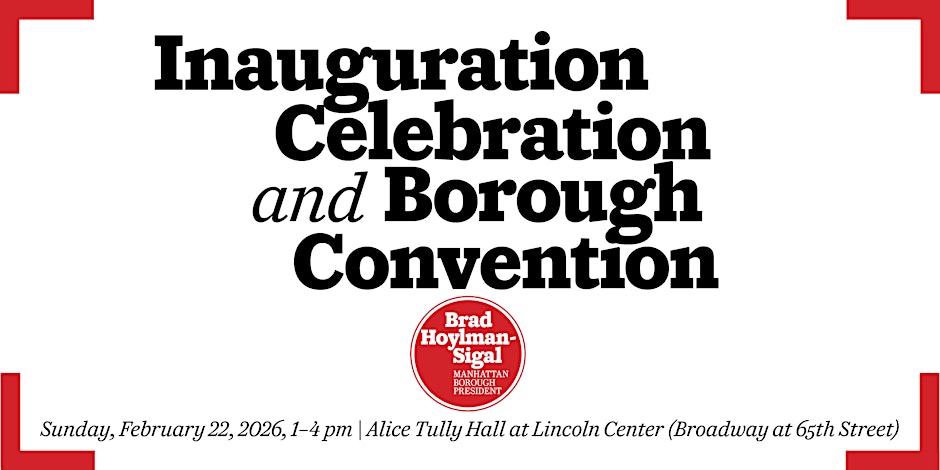 Join Manhattan Borough President, Brad Hoylman-Sigal as he is sworn into office. The Inauguration Celebration will be followed by a reception with refreshments. Followed by Manhattan's first ever Borough Convention. We invite you to join a borough-wide, facilitated conversation about the future of Manhattan. Bring your friends and family, but most of all your ideas on how to improve our borough.