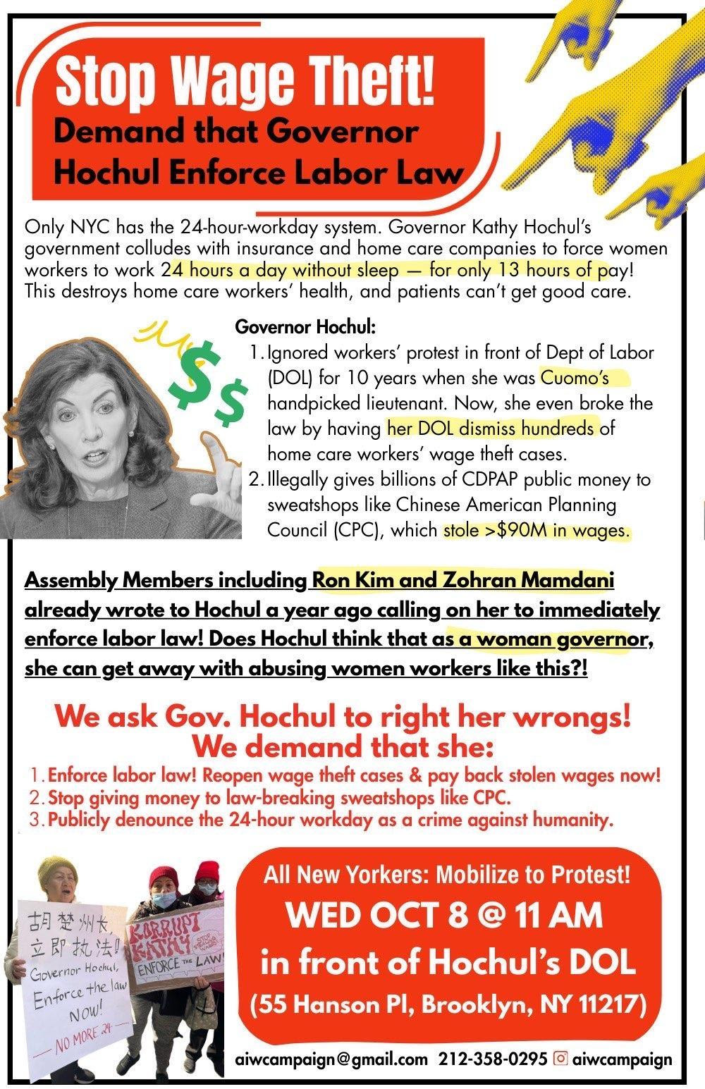 RSVP to join Oct 8 to join the protest at the Department of Labor. With wage theft at an all time high and violence of 24-hour workdays destroying the health of women home care workers, we must come together from all industries to encourage workers to join the protest. Let's demand Governor Hochul right her wrongs and enforce the law now.