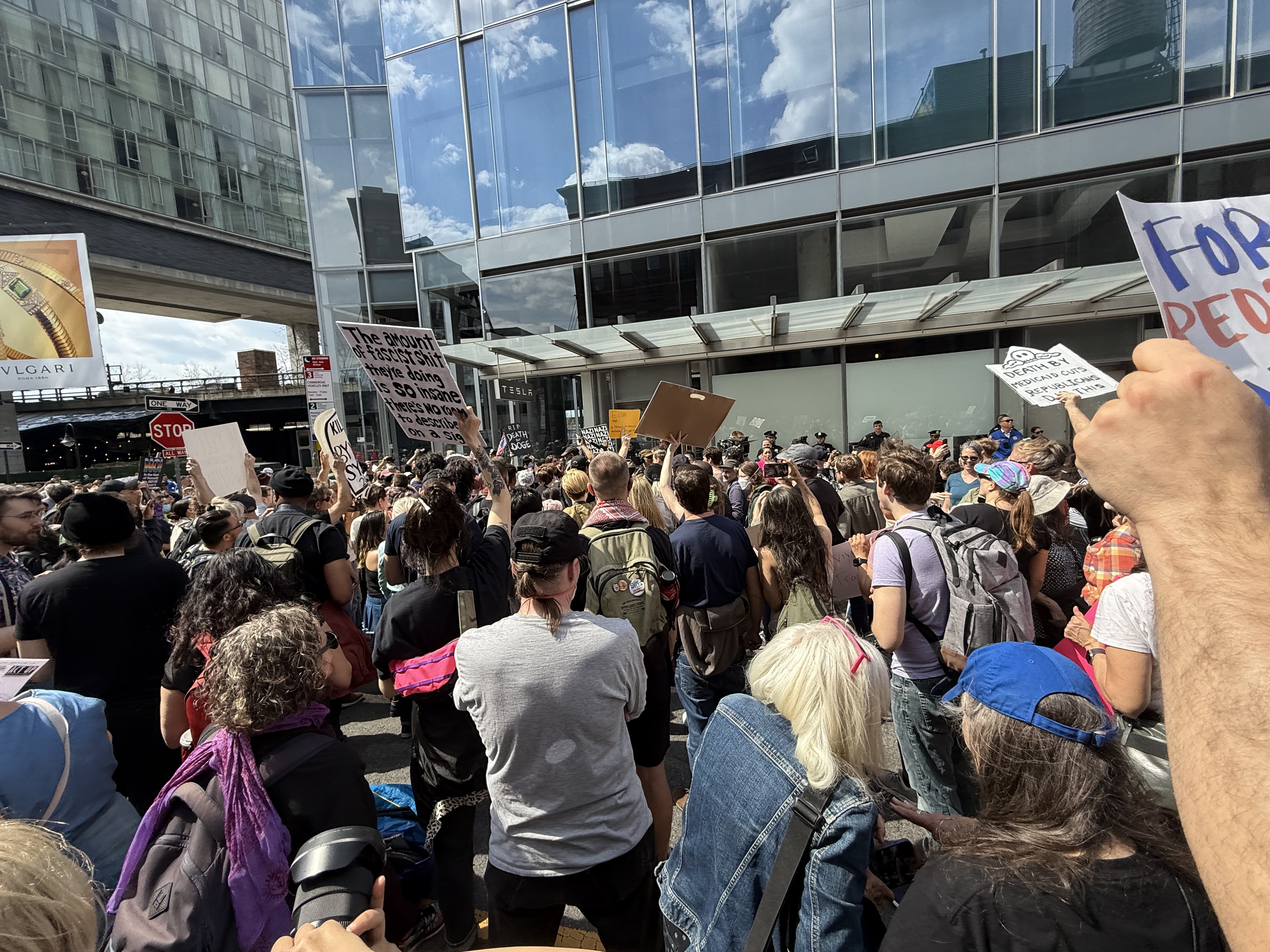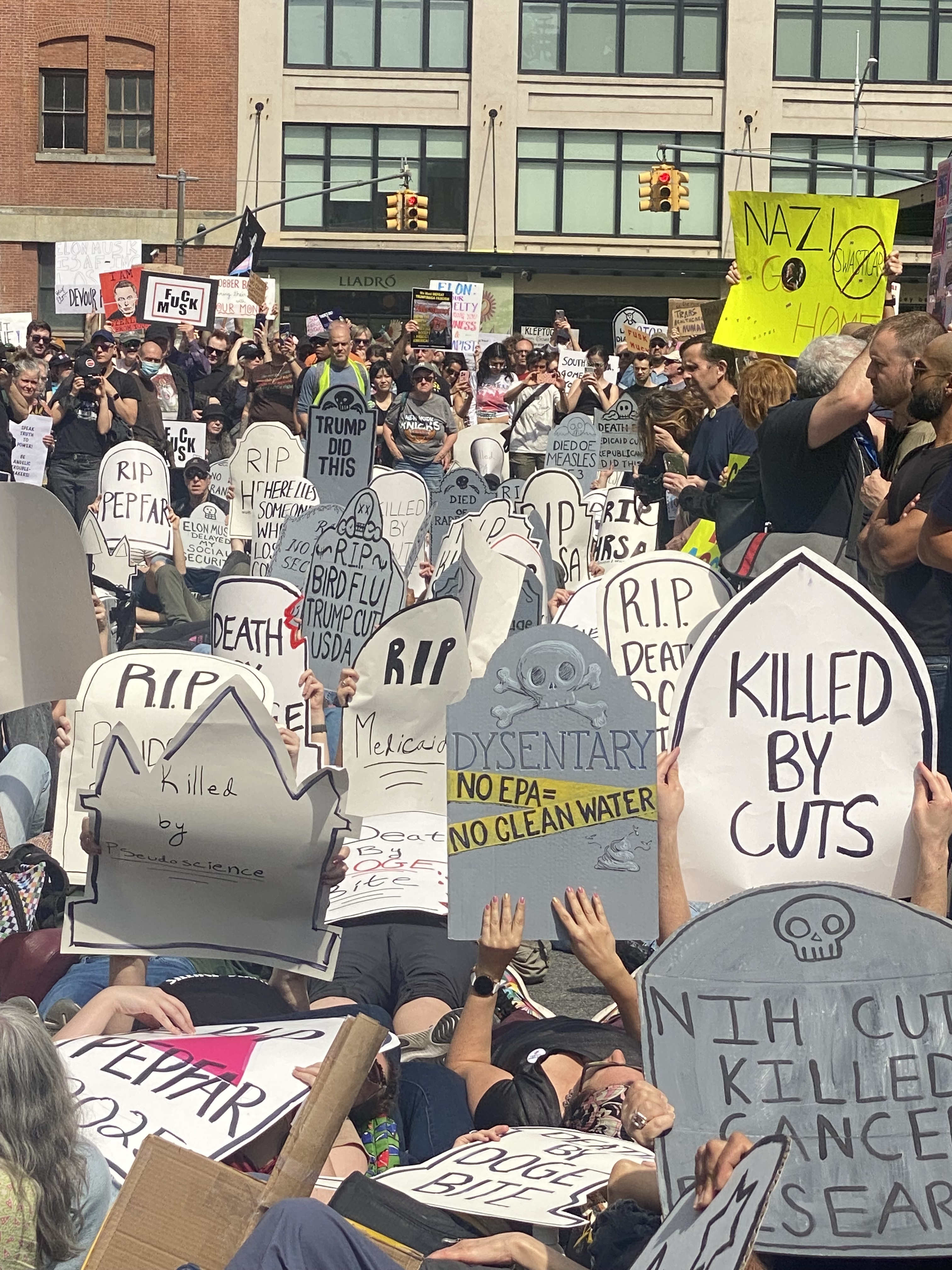 Death by 1,000 Musk Cuts: ACT UP and NYC Joined the Global Tesla Takedown. As part of Saturday’s weekly Tesla Takedown, nonviolent protests were held in over 250 cities worldwide, targeting Elon Musk’s deepening influence in the Trump administration and his role in dismantling democratic institutions and public health infrastructure.