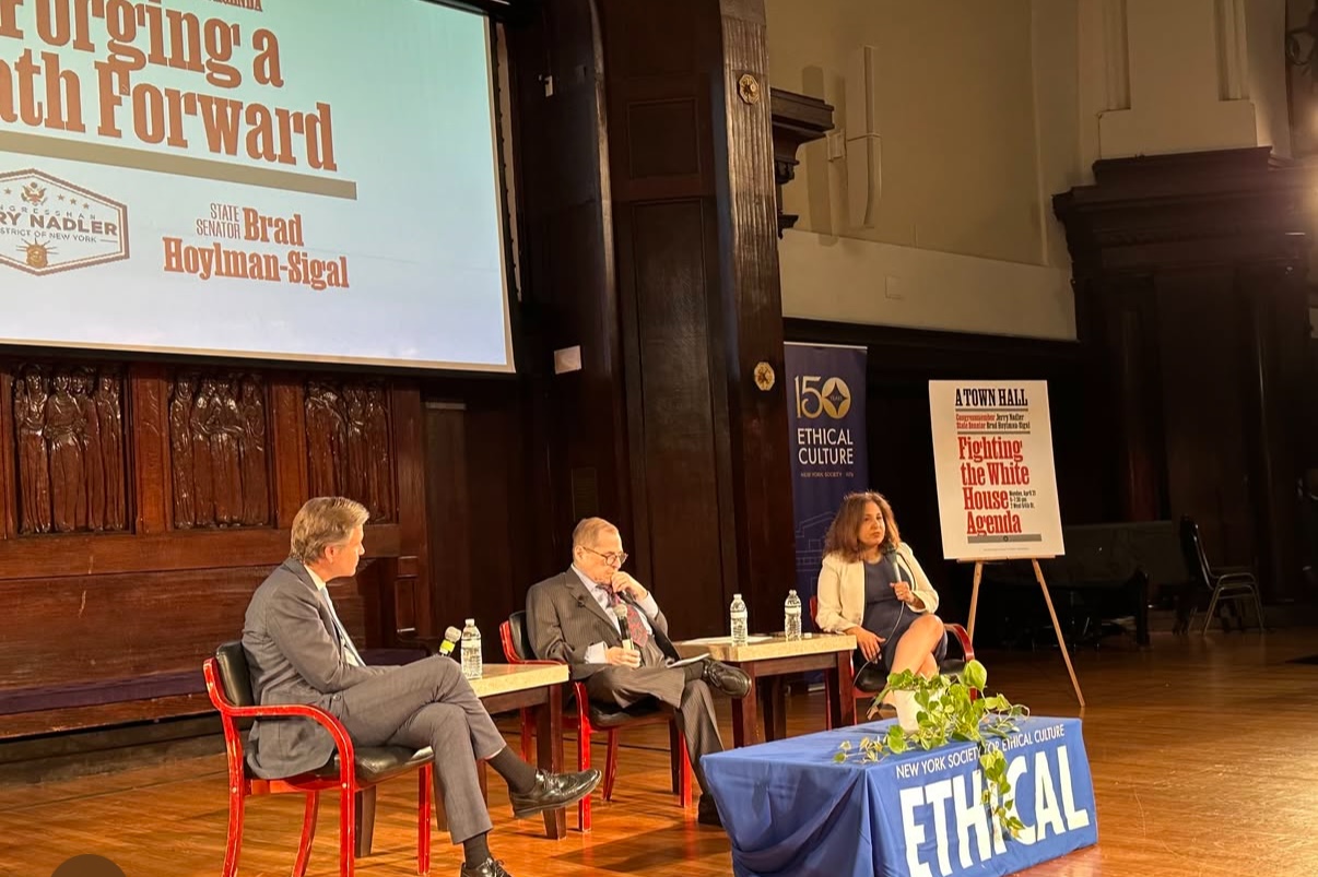 On Monday, April 21, 1,200 people registered for a town hall hosted by Congressman Jerry Nadler and State Senator Brad Hoylman-Sigal at the New York Society for Ethical Culture—far exceeding the 800-person capacity. The event focused on defending democracy and pushing back against Trump administration policies, with special guest Neera Tanden. Thank you to all the VID members who showed up.